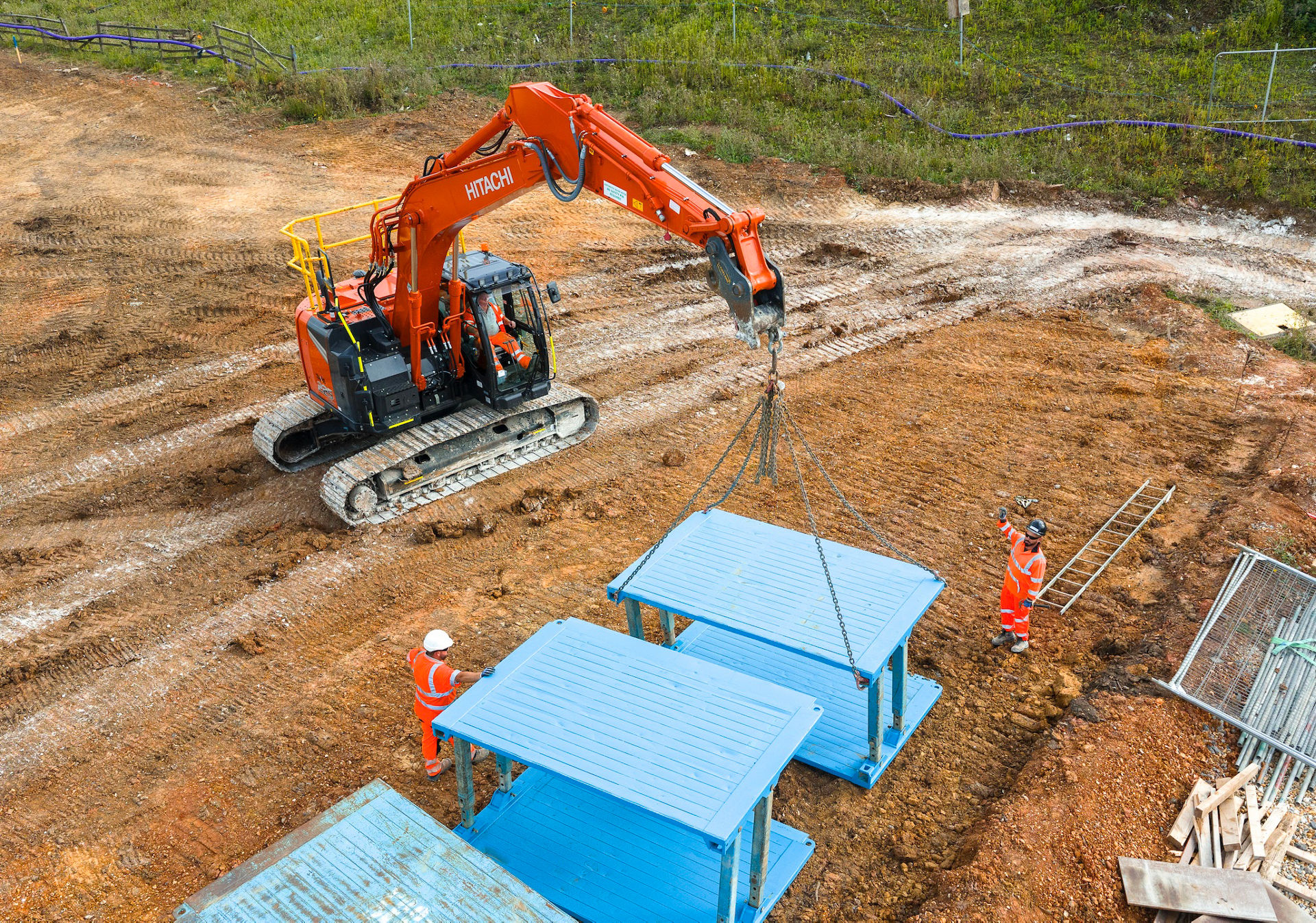 Project Manager Jon Morgan has been on site with his team since November 2024 and work is expected to continue until summer 2026. To complete their part of the project, they rely on a varied fleet of Hitachi excavators, from five to 22 tonnes, all supplied by UK rental company Synergy Hire.