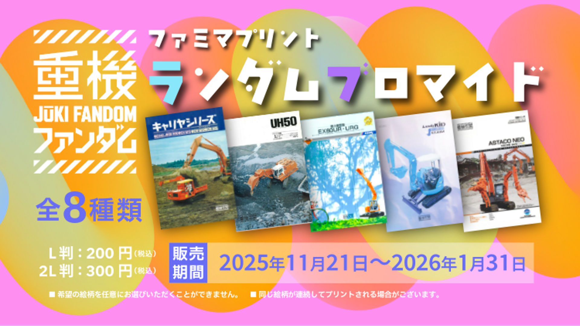 日立建機株式会社(本社:東京都台東区、執行役社長:先崎正文、以下「日立建機」)は、「建設機械の日」の制定を記念し、ファミリーマートのマルチコピー機を活用したプリントサービス「ファミマプリント」にて、カタログデザインのブロマイド販売を11月21日10時より開始します。※一部、マルチコピー機の設置がない店舗がございます。