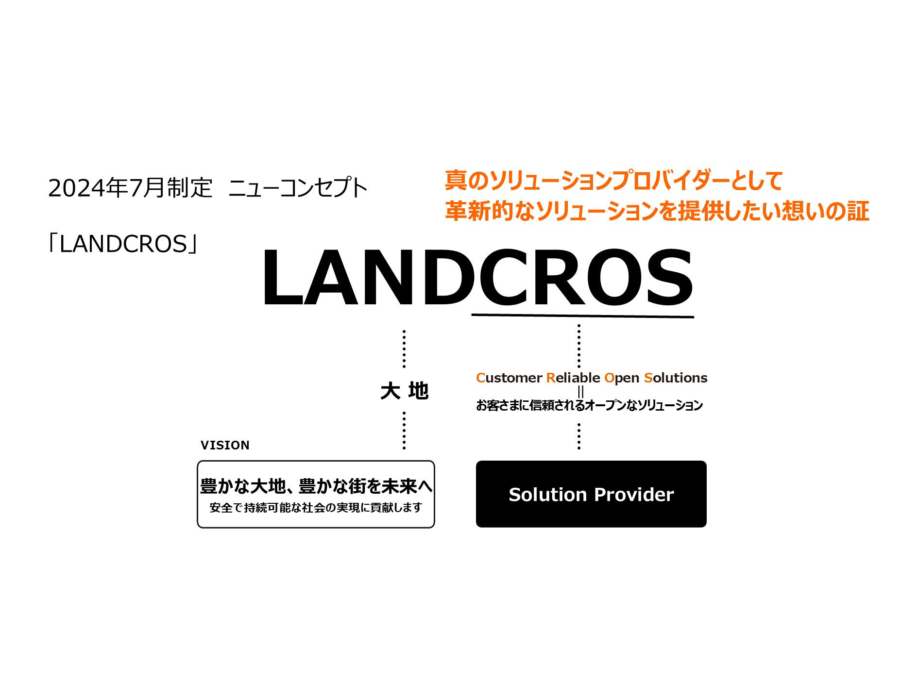2024年7月に「革新的ソリューションを提供したい」という日立建機グループの想いの証として、ニューコンセプト「LANDCROS」 を制定しました。 LADNDCROS は 5 つの想いを組み合わせたものです。 ● 豊かな大地、豊かな街の実現に貢献したい(LAND) ● お客さま(Customer)の旅に同行し、伴走したい ● お客さまにとって Reliable な存在でありたい ● お客さまやパートナーと Open に新たな事業・価値を協創し、共に発展したい ● お客さまやさまざまなステークホルダーに革新的な Solutions を提案したい