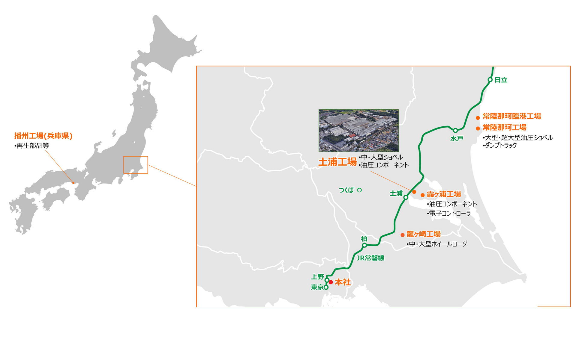 日立建機は東京都台東区に本社を構えており、生産拠点として、茨城県内に5つの工場、兵庫県に1つの工場を展開しています。