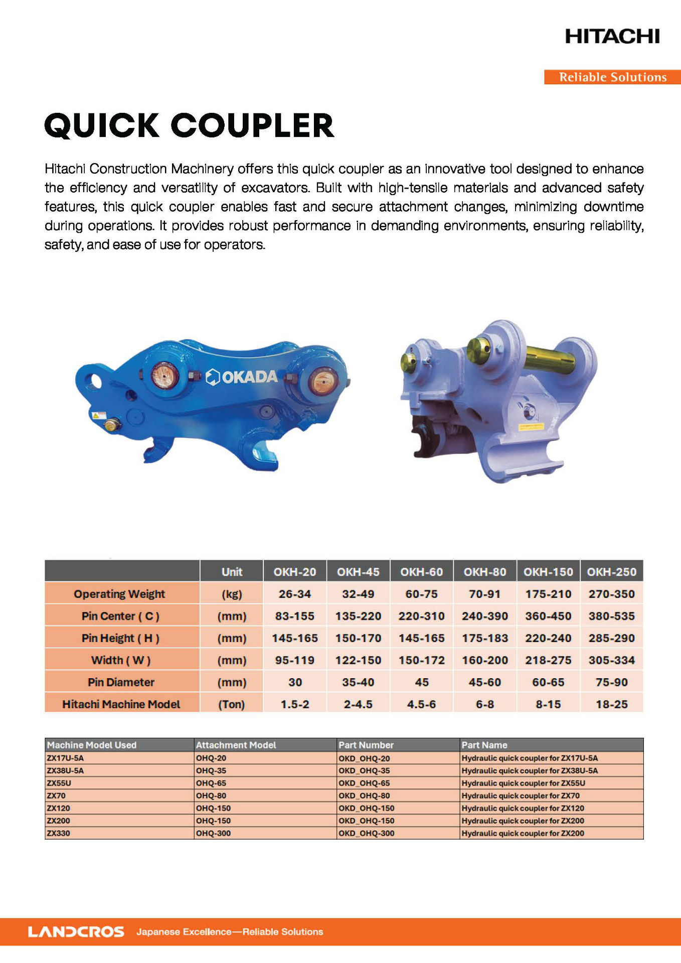 Hitachi Construction Machinery offers this quick coupler as an innovative tool designed to enhance the efficiency and versatility of excavators. Built with high-tensile materials and advanced safety features, this quick coupler enables fast and secure attachment changes, minimizing downtime during operations. It provides robust performance in demanding environments, ensuring reliability, safety, and ease of use for operators.