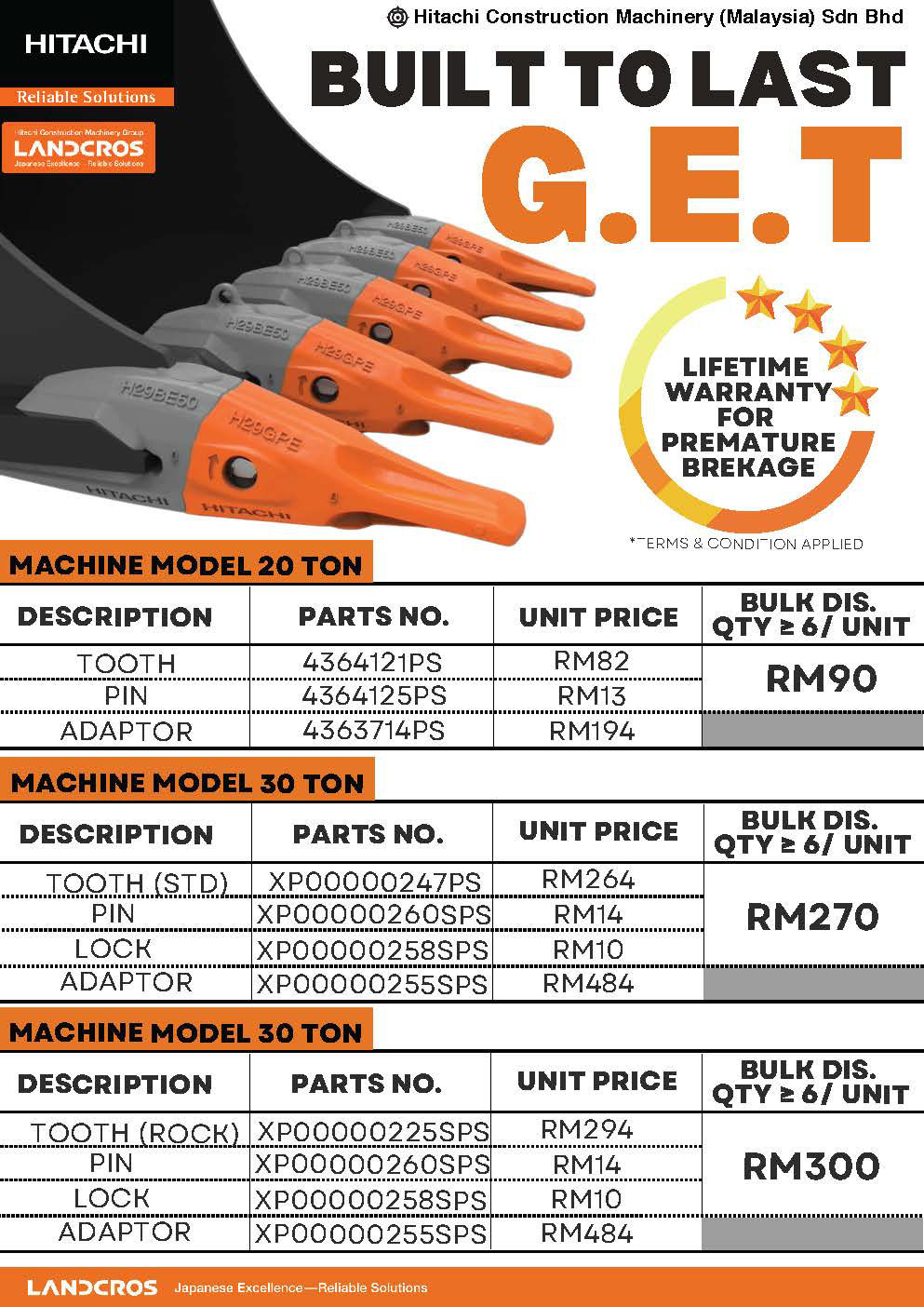 Hitachi Ground Engaging Tools (GET) is designed to complement the performance and productivity of the machine. Hitachi provides quality GET solutions for the range of Hitachi machines.
