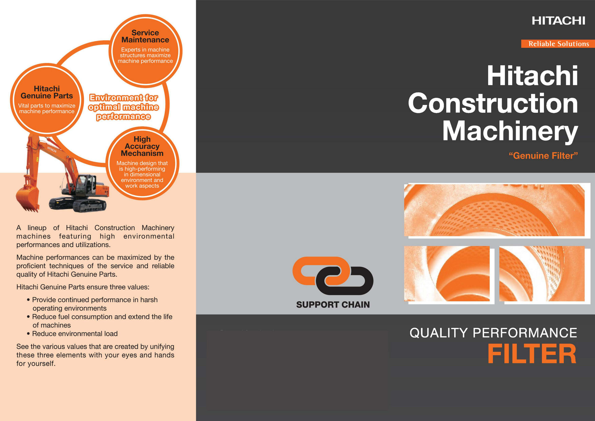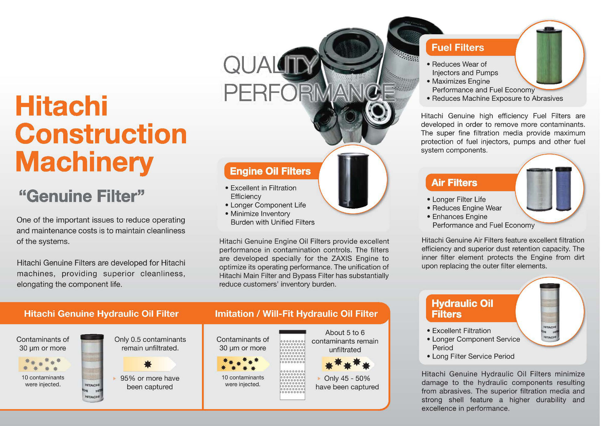 Hitachi Genuine Filters are developed for Hitachi machines, providing superior cleanliness, elongating the component life. One of the important issues to reduce operating and maintenance costs is to maintain cleanliness of the systems.