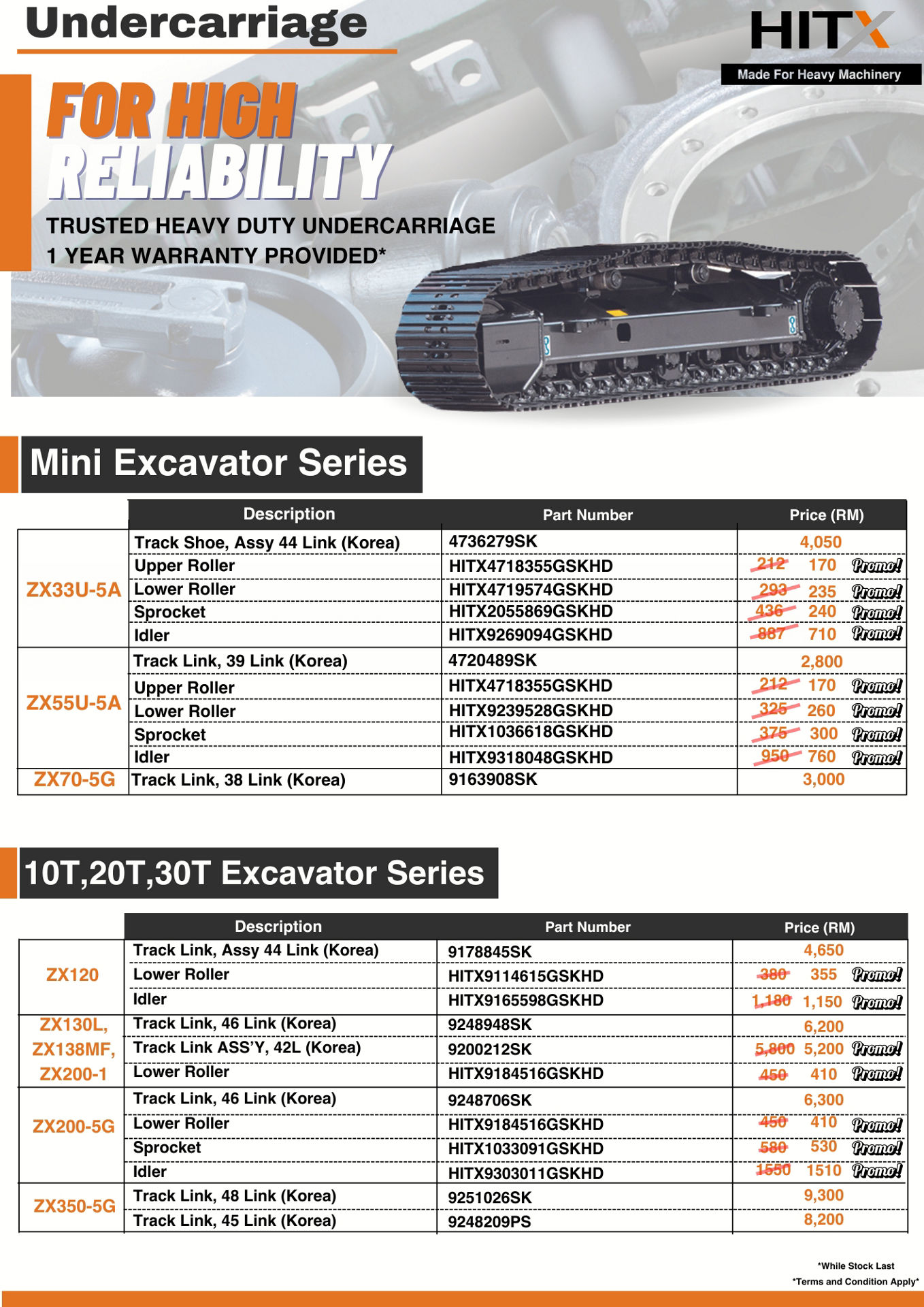 Validity: 01.01.2025 – 31.12.2025 Hitachi has selected undercarriage for customer use. Undercarriage parts include the sprockets, rollers, track link, idler. All of these parts are offered on promotion for each model, including the ZX120, ZX200-5G, and ZX350H-5G.